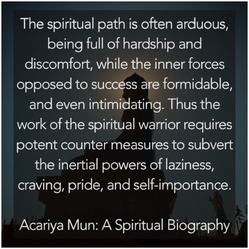 The longer I practice, the more I am coming to view the Path as requiring the qualities of a warrior. I know that the Lord Buddha himself came from the warrior care and often used martial analogies in his teaching and masters like Ajahn Mun have done the same so I feel that I’m not completely astray. Nonetheless, the idea of a spiritual warrior engaged in warfare with the kilesas is not one I have found to be overly common in the Western lay community. Regardless, it is something I’ll continue to work with until I find that it’s either no longer useful or has become an obstacle in itself.