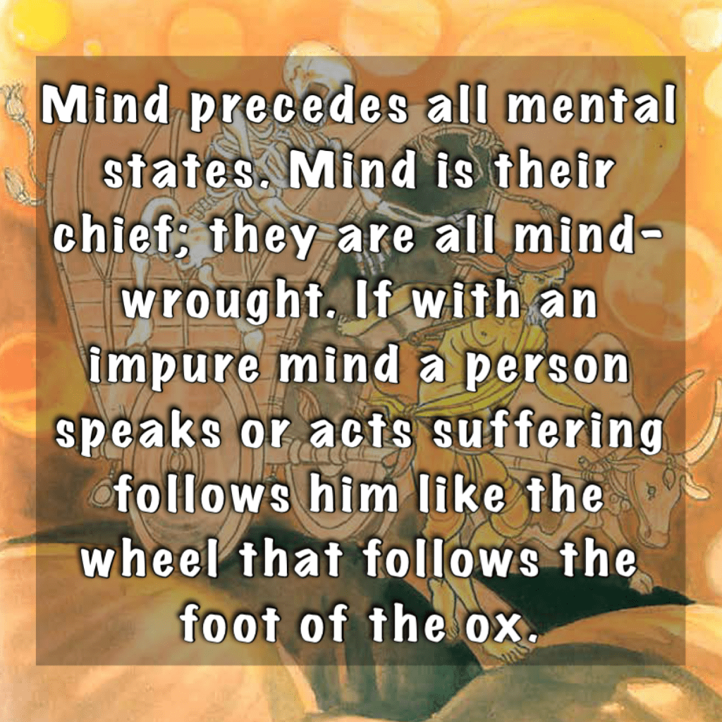 1. Mind precedes all mental states. Mind is their chief, they are all mind-wrought. If with an impure mind a person speaks or acts, suffering follows him like the wheel that follows the foot of the ox.