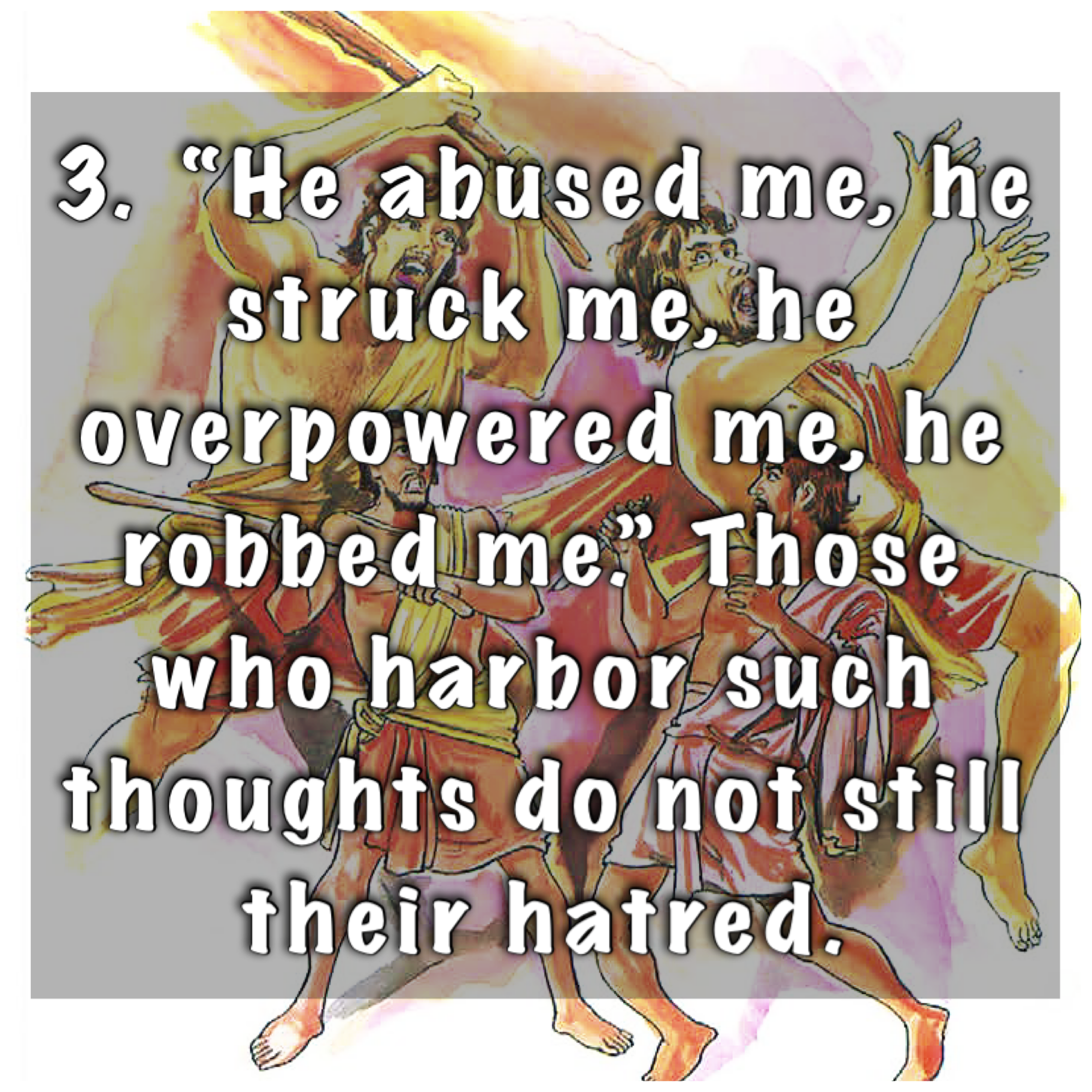 3. ” He abused, he struck me, he overpowered ne, he robbed me.” Those who harbor such thoughts do not still their hatred.