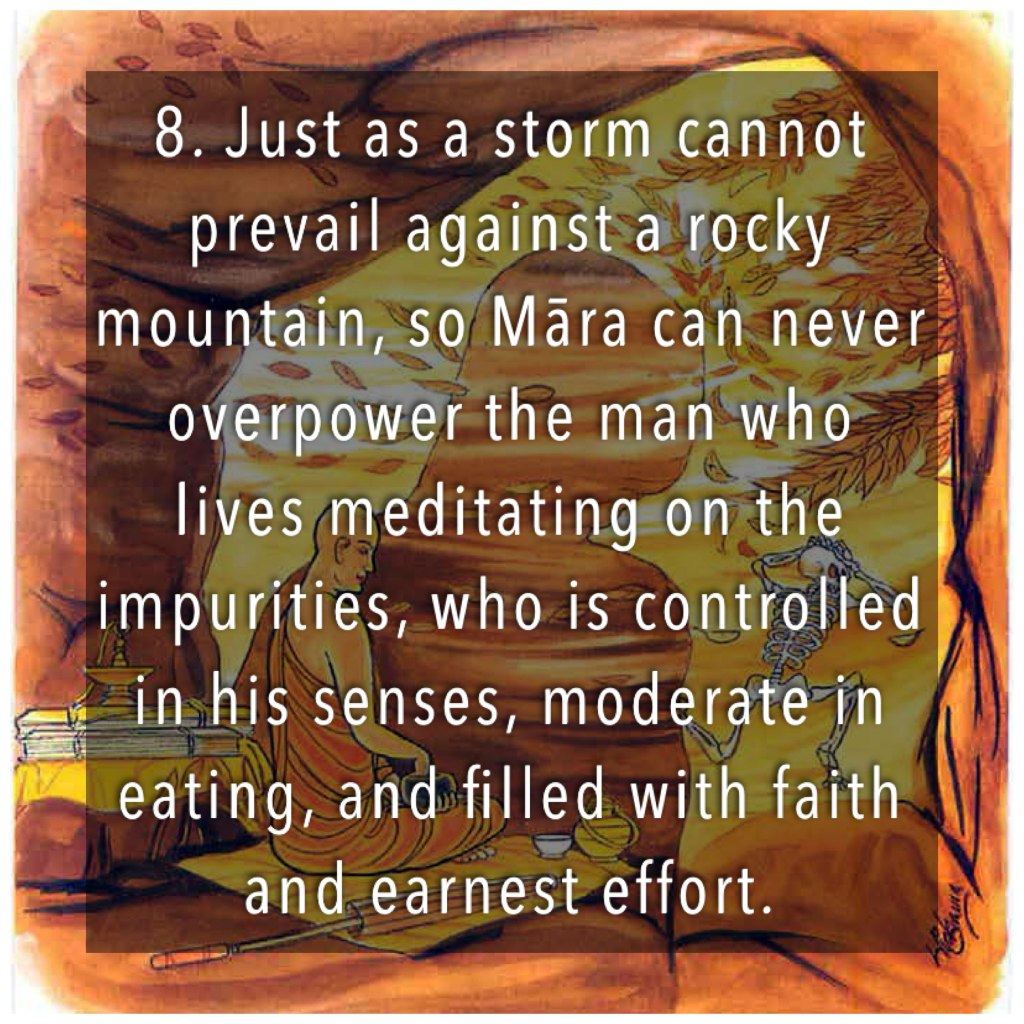 8. Just as a storm cannot prevail against a rocky mountain, so Mara can never overpower the man who lives meditating on the impurities, who is controlled in his senses, moderate in eating, and filled with faith and earnest effort.