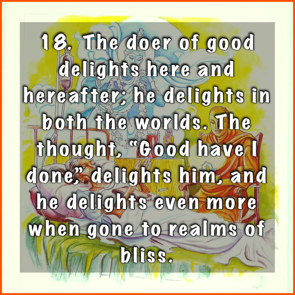 18. The doer of good delights here and hereafter; he delights in both the worlds. The thought, “Good have I done,” delights him, and he delights even more when gone to realms of bliss.