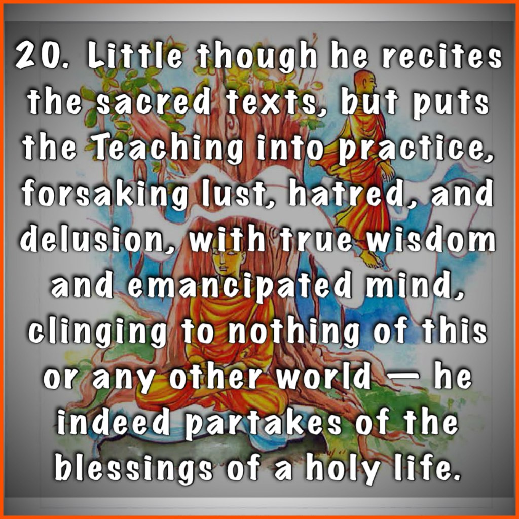 20. Little though he recites the sacred texts, but puts the Teaching into practice, forsaking lust, hatred, and delusion, with true wisdom and emancipated mind, clinging to nothing of this or any other world—he indeed partakes of the blessings of a holy life.
