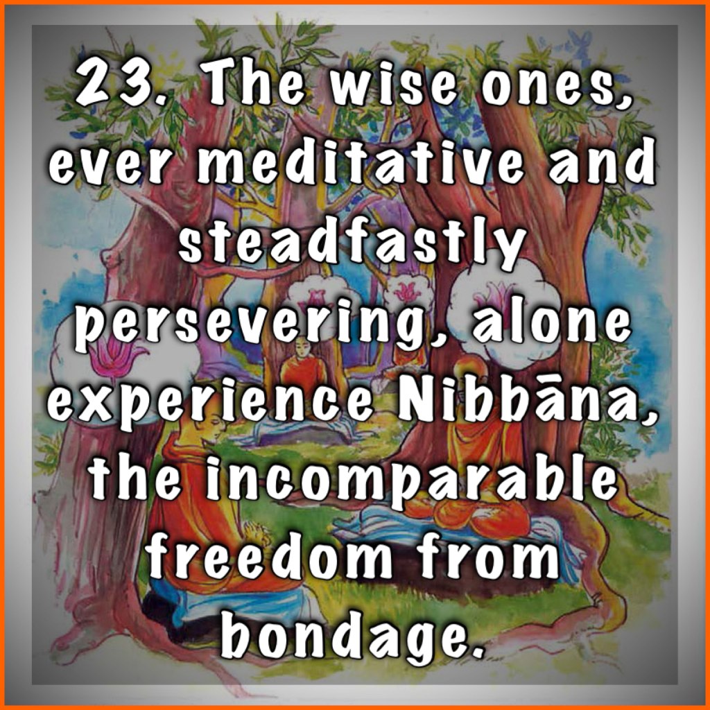 23. The wise ones, ever meditative and steadfastly persevering, alone experience Nibbana, the incomparable freedom from bondage.