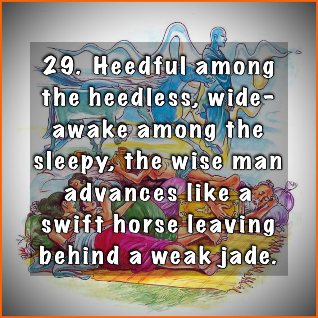 29. Heedful among the heedless, wide-awake among the sleepy, the wise man advances like a swift horse leaving behind a weak jade.