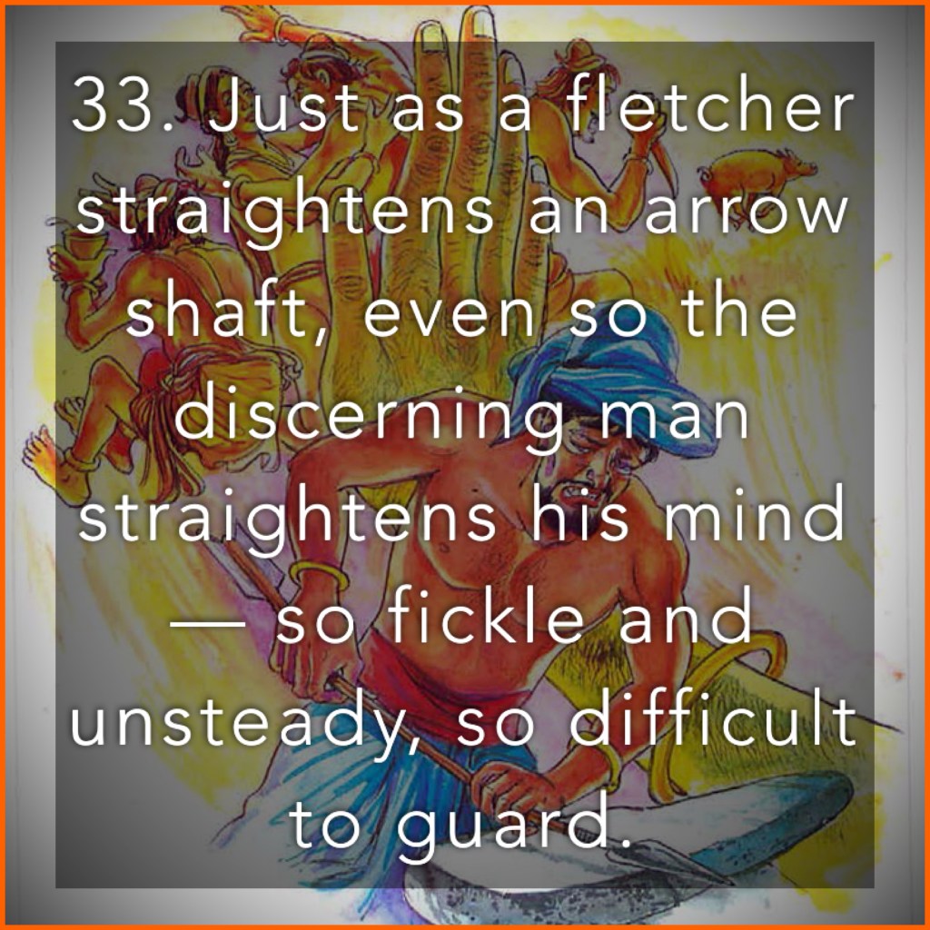 33. Just as a fletcher straightens an arrow shaft, even so the discerning man straightens his mind — so fickle and unsteady, so difficult to guard.