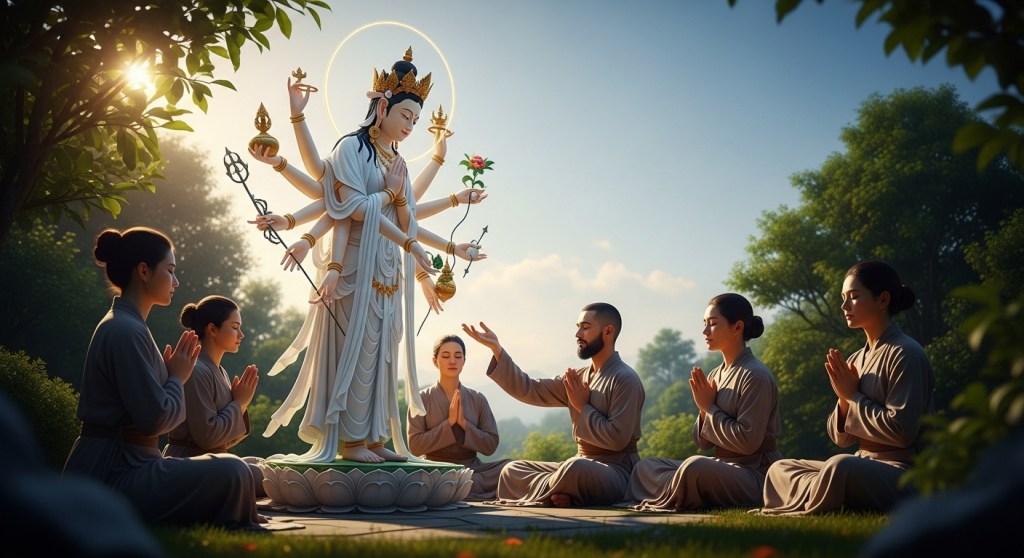 Avalokiteśvara once vowed, “If ever I shrink from my vow to liberate all beings, may my body shatter into a thousand pieces.” At one point, overwhelmed by the suffering of saṃsāra, he faltered—and his body broke apart. Through the compassionate blessing of Amitābha Buddha, he re-formed with eleven heads and a thousand arms to better hear and help all beings.
